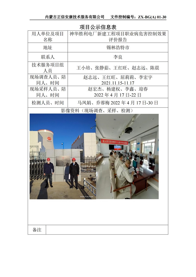 神華勝利電廠新建工程項目職業病危害控制效果評價報告公示信息表