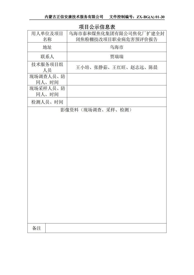 烏海市泰和煤焦化集團有限公司焦化廠擴建全封閉焦粉棚技改項目職業病危害預評價報告公示信息表