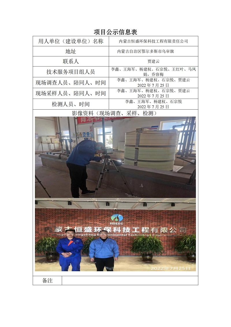 內蒙古恒盛環保科技有限公司定期檢測項目公示