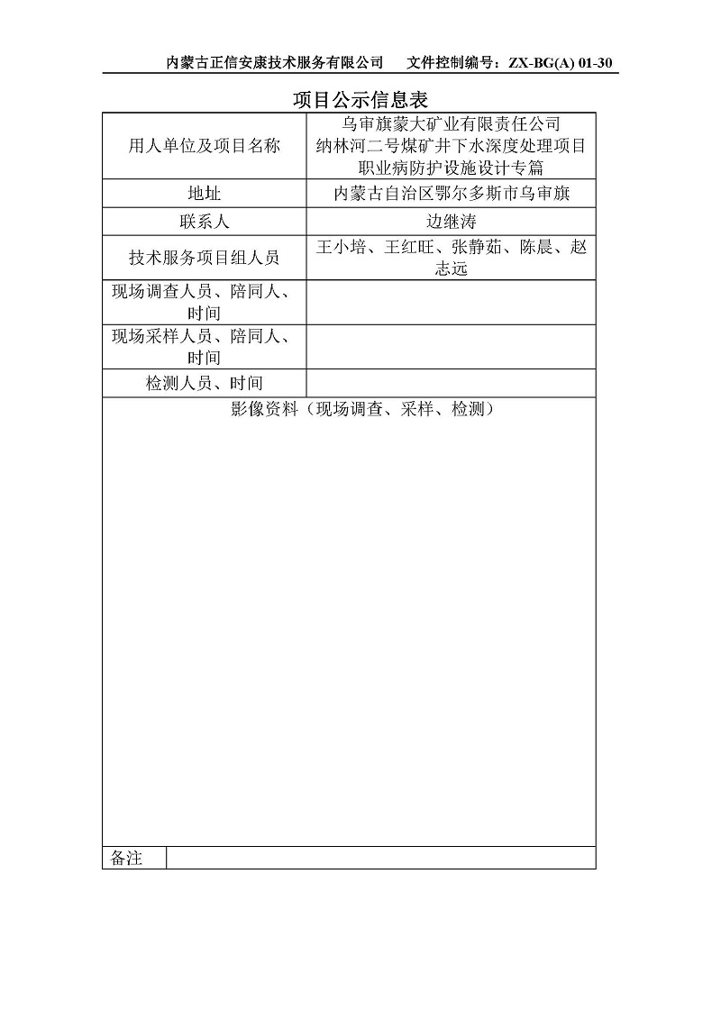 烏審旗蒙大礦業有限責任公司納林河二號煤礦井下水深度處理項目職業病防護設施設計專篇信息公示表
