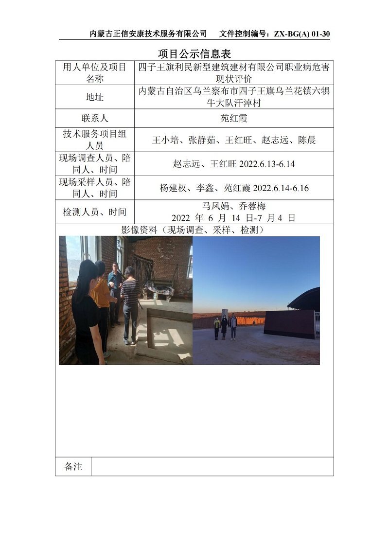 四子王旗利民新型建筑建材有限公司職業(yè)病危害現(xiàn)狀評價項目公示信息表