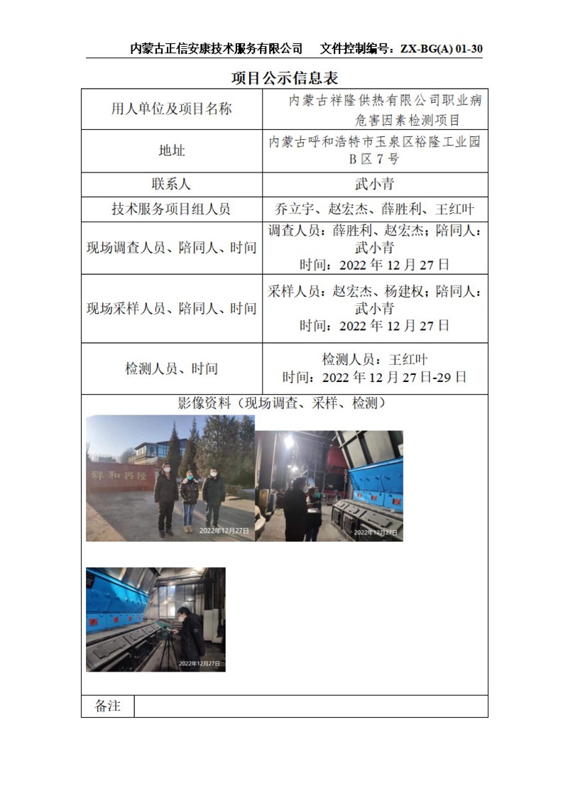 內蒙古祥隆供熱有限公司職業病危害因素檢測項目公示信息表