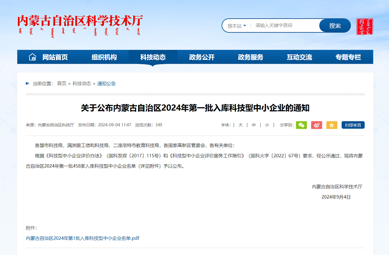 熱烈祝賀公司成功申報內蒙古自治區2024年第一批入庫科技型中小企業