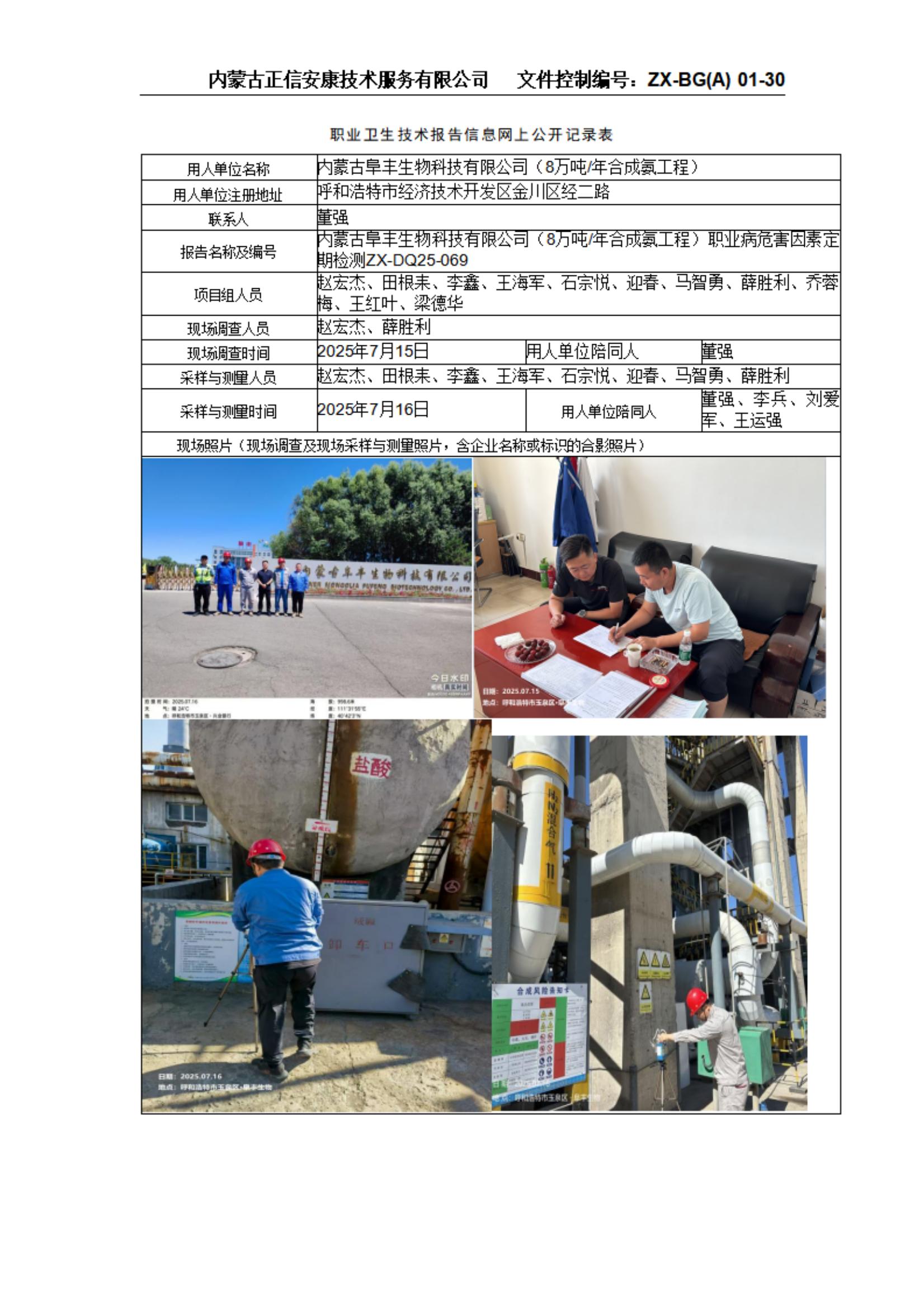 內蒙古阜豐生物科技有限公司(8萬噸/年合成氨工程)職業病危害因素定期檢測